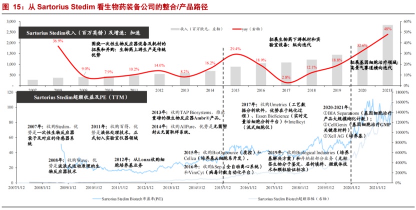 复盘生物工艺巨头赛多利斯的股价长牛之路(6年8倍),该公司在2010-2020年营收年复合增速15%,盈利能力持续提升。股价长牛的背后,是其在150多年发展历程中,一边巩固自身技术护城河,一边通过收购打通产业上下游,进而成长为平台型生命科学服务龙头。