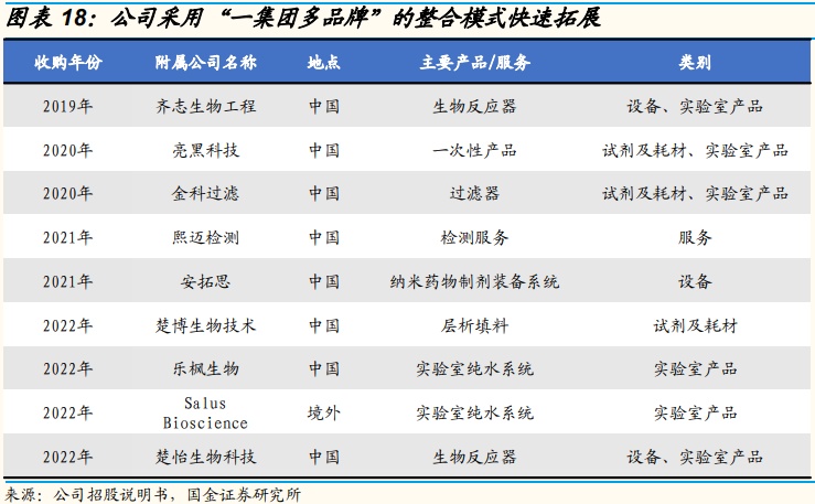 2019年以来,多宁生物先后收购及整合了齐志生物、亮黑科技、金科过滤、熙迈检测、安拓思、楚博生物、乐枫生物、SALUS和楚怡生物9家企业,覆盖了生物工艺上下游的核心产品,如培养基、生物反应器、层析填料、一次性耗材、过滤器等。