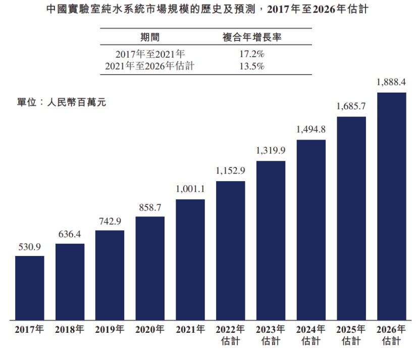 以实验室纯水系统为例,据弗若斯特沙利文预计,中国实验室纯水系统2021年市场规模约为10.01亿元,预计在2026年达到18.88亿元,2021年至2026年的复合年增长率为13.5%,市场空间可期。