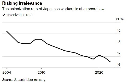 在过去的几十年里,日本工会成员数量也在逐渐减少。去年,工会的整体加入率创下16.5%的新低,女性会员为12.5%,兼职会员为8.5%。