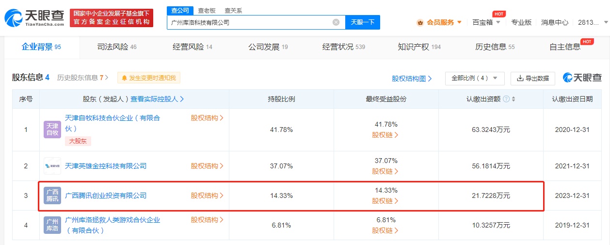 智通财经APP获悉,天眼查App显示,近日,广州库洛科技有限公司发生工商变更,股东新增广西腾讯创业投资有限公司,同时公司注册资本由约138.92万人民币增至约151.55万人民币,增幅约9.1%。