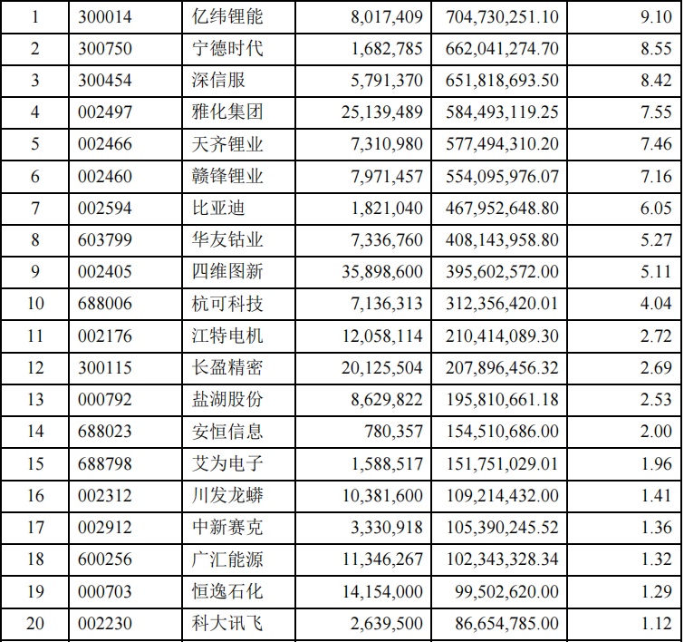 持仓方面,以规模最大的产品汇丰晋信低碳先锋为例,除之前已公布的前十大重仓股外,该基金的“隐形”重仓股(排名第11名至第20名)分别为江特电机(002176.SZ)、长盈精密(300115.SZ)、盐湖股份(000792.SZ)、安恒信息(688023.SH)、艾为电子(688798.SJ)、川发龙蟒(002312.SZ)、中新赛克(002912.SZ)、广汇能源(600256.SH)、恒逸石化(000703.SZ)、科大讯飞(002230.SZ)。