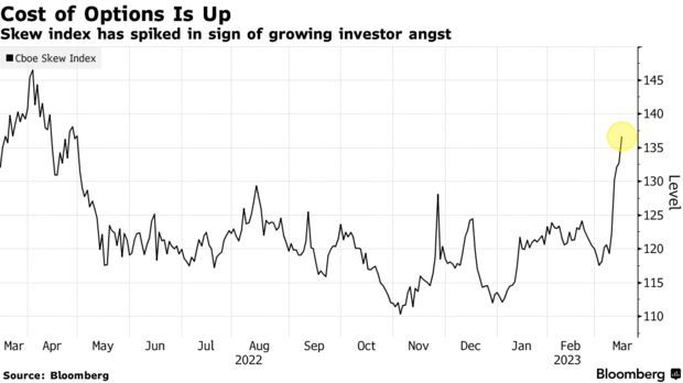 与2022年下半年标普500指数的任何下跌未能引发芝加哥期权交易所(Cboe)波动率指数(VIX)的任何重大反应不同,过去两周,标普500指数下跌2%,而波动率指数跃升逾4个百分点,达到去年10月以来的最高水平。