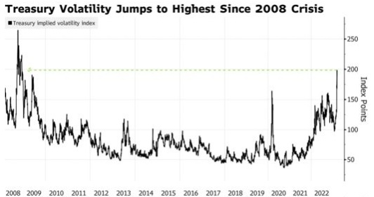 智通财经APP获悉,债券交易员正在焦急等待下周的美联储会议,此前美国债券市场经历了十多年来最动荡的5天。追踪美国国债收益率波动走势的MOVE指数周三触及199点,为2008年全球金融危机以来最高水平,较1月底上涨逾一倍。作为全球最安全的证券之一,2年期美国国债收益率本周在3.71%至4.53%之间波动,为2008年9月以来最大单周波动区间。