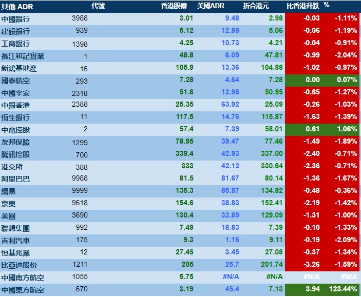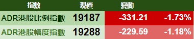 智通财经APP获悉,周五美股三大指数下跌,港股ADR指数下跌,按比例计算,收报19187点,较香港收市跌331.21点或1.73%。