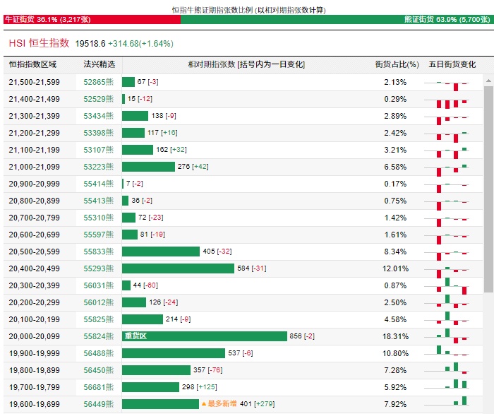 法兴恒指牛熊证街货分布图中的数据显示,熊证街货重货区在20000-20099区间,该区间最新熊证数量为856张,较上一交易日减少2张;最多新增在19600-19699区间,该区间最新熊证数量为401张,较上一交易日增加279张。