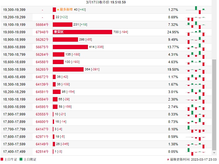 牛证街货重货区在19000-19099区间,该区间最新牛证数量为700张,较上一交易日减少194张;最多新增在19300-19399区间,该区间最新牛证数量40张,较上一交易日增加40张。