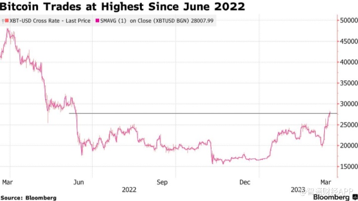智通财经APP获悉,银行业的动荡、高于预期的通胀数据,以及人们对美联储“鸽派转向”的预期重燃,使得比特币达到了约9个月以来的最高水平。比特币自2022年6月以来首次突破2.8万美元,周日的交易价格高达28258美元。自今年年初以来,比特币的价格上涨了近70%。其他数字资产也出现了上涨,以太坊自上周初以来上涨了约17%,而Solana 和 Cardano 等所谓的代币也在上涨。