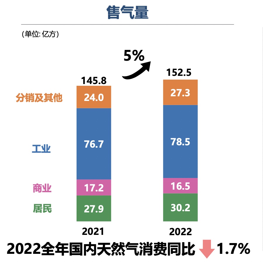 其实2022年以来,在国内经济增长放缓和国际LNG价格高企的影响下,工业用气量同比下降,同时随着居民用气受暖冬影响增量放缓,两者叠加,使得天然气的消费总量出现负增长。