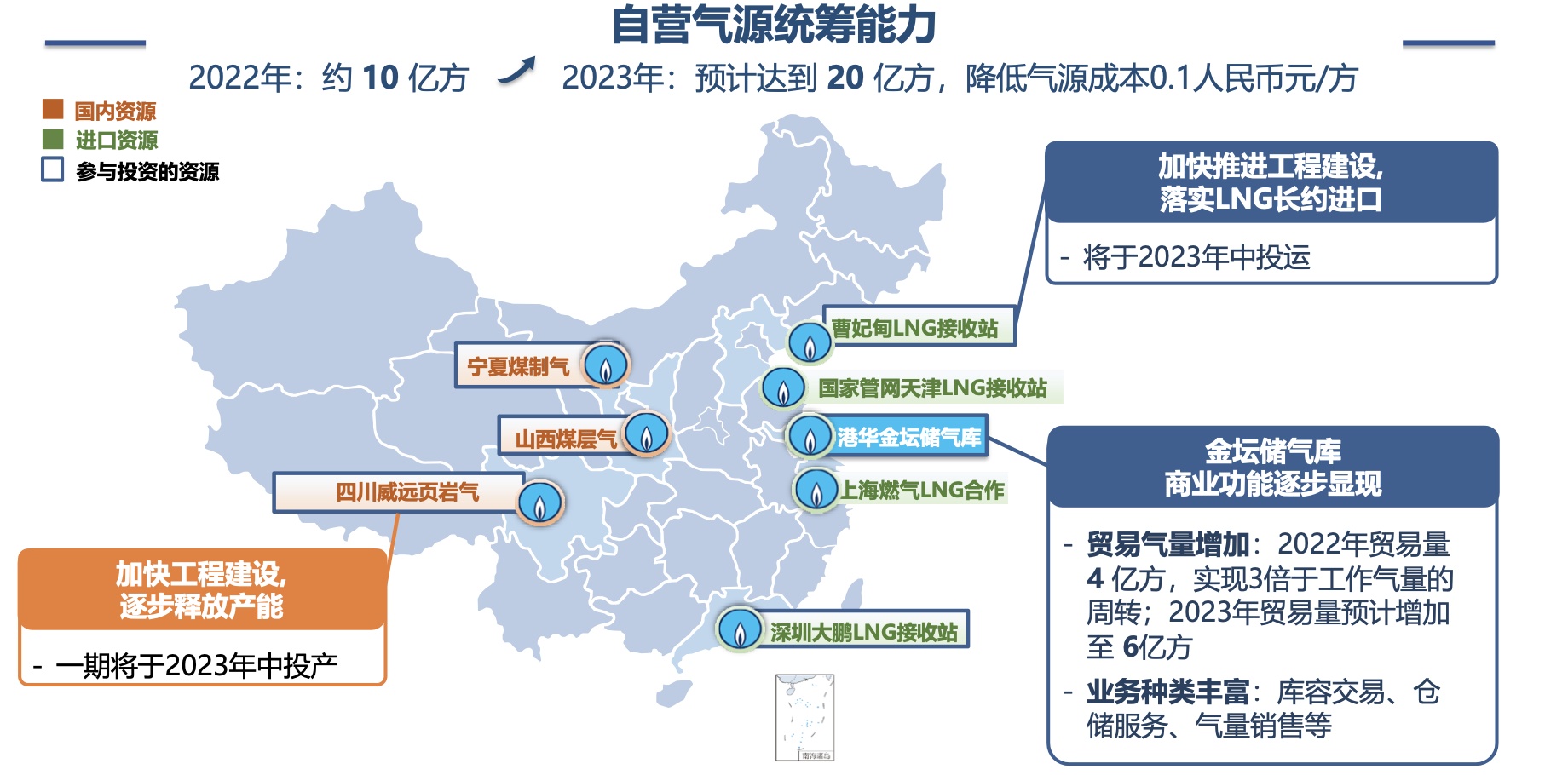 据智通财经APP了解,2022年全年,公司的自营气源已到达10亿方,期内金坛储气库的商业功能逐步显现,2022年贸易量达到4亿方,成功实现3倍于工作气量的周转。预计随着四川威远页岩气一期逐步投产,以及曹妃甸LNG接收站投入运营,2023年公司自营气源有望达到20亿方,气源成本或将降低0.1元人民币/方。