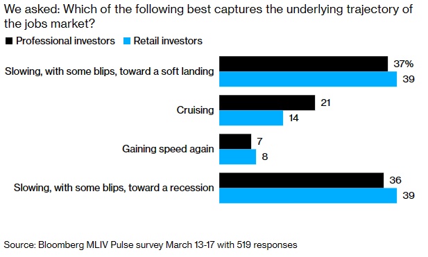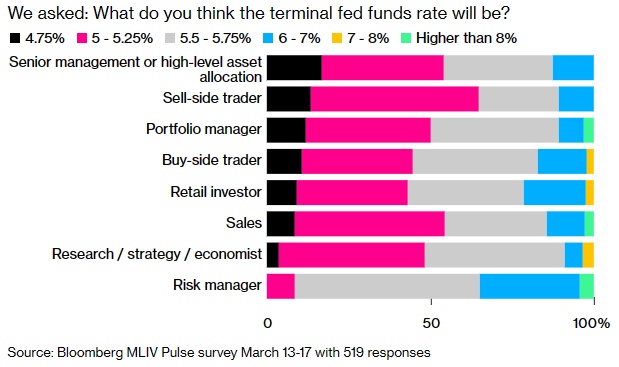 然而,在接受MLIV Pulse调查(3月13日至17日期间)的519名投资者(包括专业机构和散户投资者)看来,大多数受访者认为,美国经济将避免硬着陆。约三分之二的受访者预测,美国经济要么正在走向软着陆,要么正在增长,要么将不着陆。另外,大多数受访者倾向于认为美联储将继续加息,使通胀更接近其目标水平。