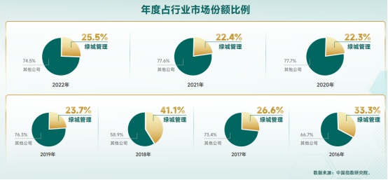 近期,中指研究院公布2022代建行业市占率情况,数据显示,2022年绿城管理市占率为25.5%,不仅连续七年蝉联行业第一身位,还在市场入局者激增的情况下不降反增。强大的竞争能力,得益于其作为代建第一股的龙头优势、全国性布局和充足的项目储备。