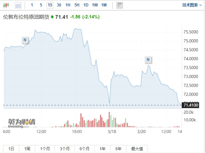 值得一提的是,瑞士信贷(CS.US)的动荡引发了整个市场的恐慌,本周全球市场动荡不安。受此影响,油价已跌至15个月低点,布伦特原油上周下跌12%,截至发稿,布伦特原油跌2.14%,报71.41美元/桶。