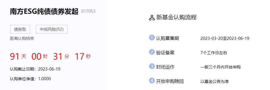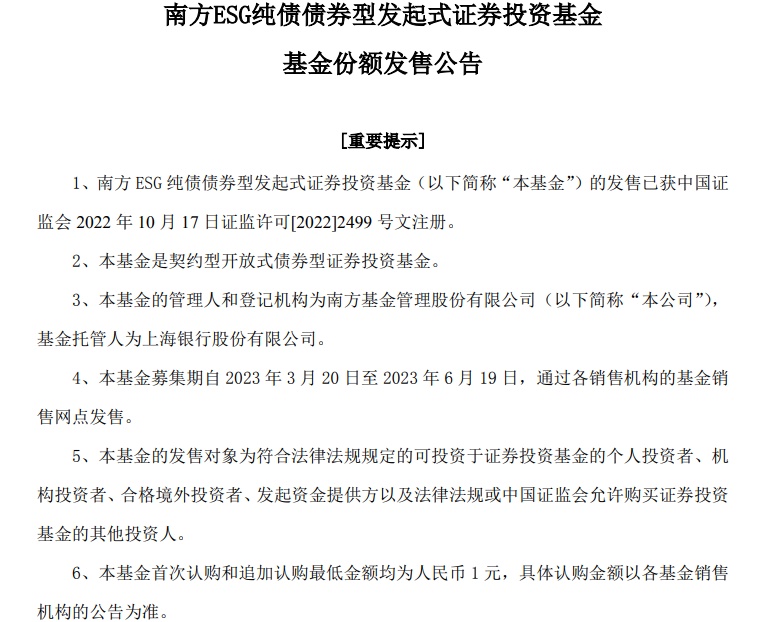 智通财经APP获悉,3月20日,南方ESG纯债债券型发起式证券投资基金(简称:南方ESG纯债债券发起)公开发售,募集期截至6月19日。公告显示,该基金为契约型开放式债券型证券投资基金,基金管理人和登记机构为南方基金,基金托管人为上海银行股份有限公司。