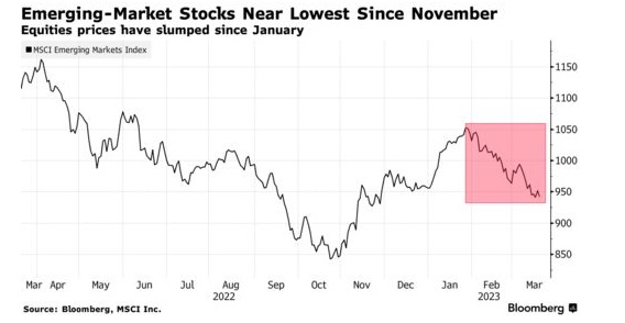 智通财经APP获悉,在全球各国当局为遏制银行业危机于周末进行的干预之后,新兴市场行情下挫,MSCI发展中国家指数下跌约 1%,交易员们为潜在的货币市场进一步波动做好了准备。在外汇市场,交易员正在对冲价格波动更大的风险,所有发展中国家货币的单月隐含波动率指标都在上升。