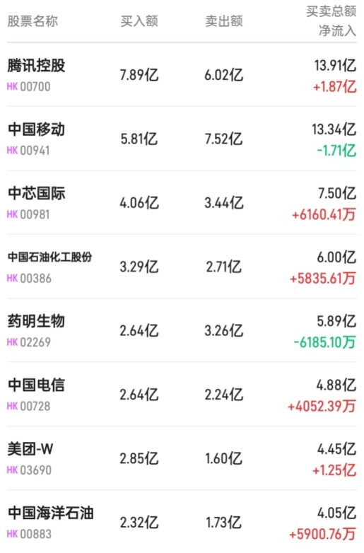 北水净买入最多的个股是恒生中国企业(02828)、腾讯(00700)、中芯国际(00981)。北水净卖出最多的个股是中国移动(00941)、李宁(02331)、中海油(00883)。