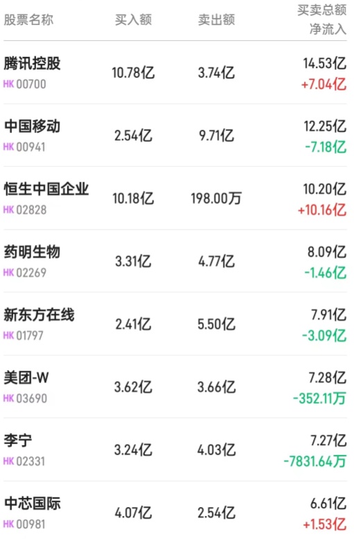 此外,恒生中国企业(02828)获净买入10.15亿港元,而李宁(02331)遭净卖出7831万港元。