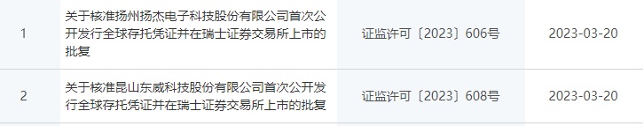 智通财经APP获悉,3月20日,中国证监会网站发布关于核准昆山东威科技股份有限公司(简称:东威科技(688700.SH))、扬州扬杰电子科技股份有限公司(简称:扬杰科技(300373.SZ))首次公开发行全球存托凭证并在瑞士证券交易所上市的批复。