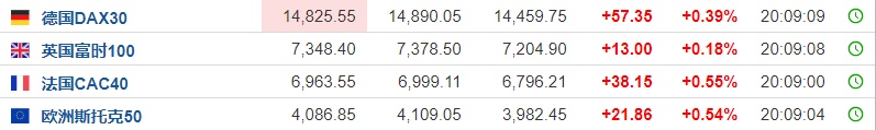 2. 截至发稿,德国DAX指数涨0.39%,英国富时100指数涨0.18%,法国CAC40指数涨0.55%,欧洲斯托克50指数涨0.54%。