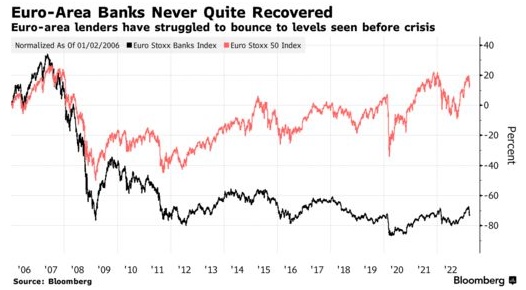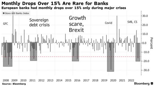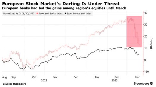 智通财经APP获悉,瑞信(CS.US)迅速出售给瑞银集团(UBS.US),以及该公司风险最高的AT1债券被抛售,对今年最受欢迎的欧洲股市交易,以及该地区的整体投资情绪构成了重大风险。本来在银行业危机出现前,欧洲银行股在经历了多年的低迷之后,终于开始押注它们是利率上升的主要赢家,但瑞信的突然危机导致其被瑞银收购,对投资者来说,不仅在该地区的银行,而且在金融权重最大的更广泛的地区股票市场中,警钟敲响了。