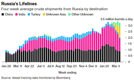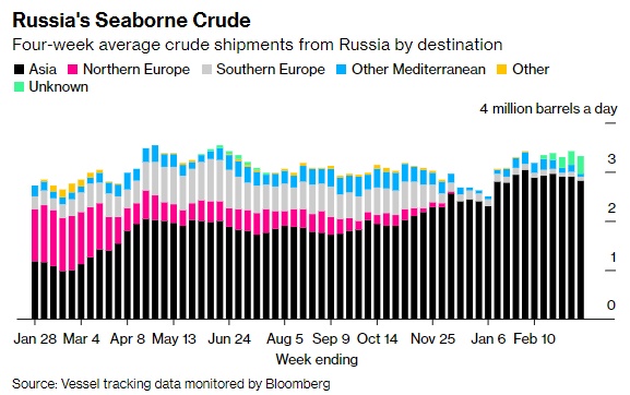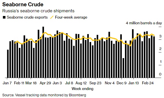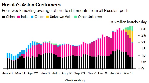 截至3月17日,俄罗斯对亚洲客户的四周平均发货量(加上没有最终目的地的船只)基本持平,为每日318万桶,此前为每日319万桶。