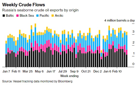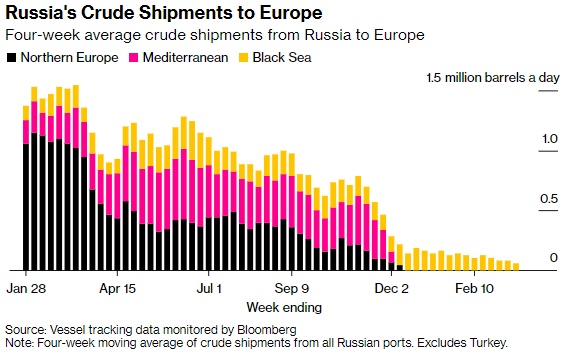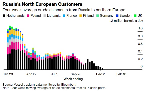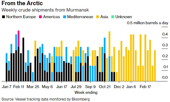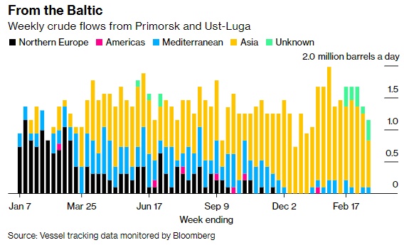 来自波罗的海、黑海和北极的出口码头每天消耗150多万桶短途原油的市场已经几乎完全消失,取而代之的是成本更高、耗时更长的亚洲长途目的地。