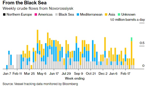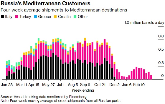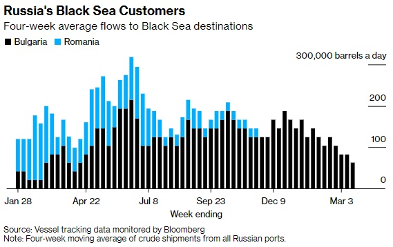 在截至3月17日的四周内,俄罗斯对土耳其的出口降至每天7.8万桶。土耳其是俄罗斯仅存的地中海客户。流入原油还不到去年9月份高点的五分之一。