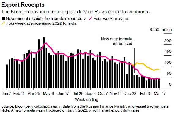 在截至3月17日的7天里,俄罗斯原油出口关税流入该国政府的资金减少了100万美元,至4400万美元,而四周平均收入持平于4300万美元。