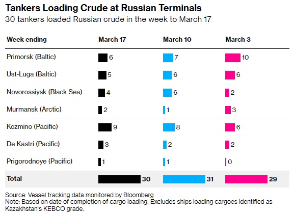 船舶跟踪数据和港口代理报告显示,在截至3月17日的一周内,共有30艘油轮装载了2,260万桶俄罗斯原油。这比上周减少了64万桶,即3%。目的地是基于船舶在撰写本文时发出的航行方向信号,其中一些目的地几乎肯定会随着航行的进行而改变。所有数据都不包括被确定为哈萨克斯坦KEBCO等级的货物。