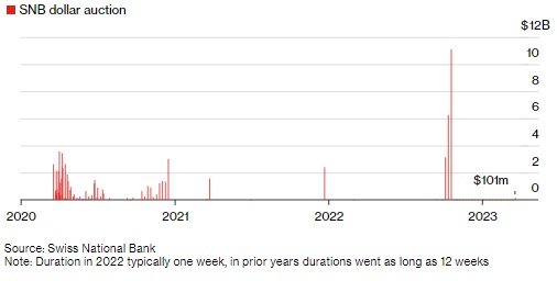 具体来说,瑞士央行提供了每日从美联储获得美元的机会,这不同于往日的每周一次,而瑞士央行通过每周7天到期的回购操作发放了1.01亿美元,这是自2022年10月以来最多的一次,但远低于以往普遍的资金紧张。
