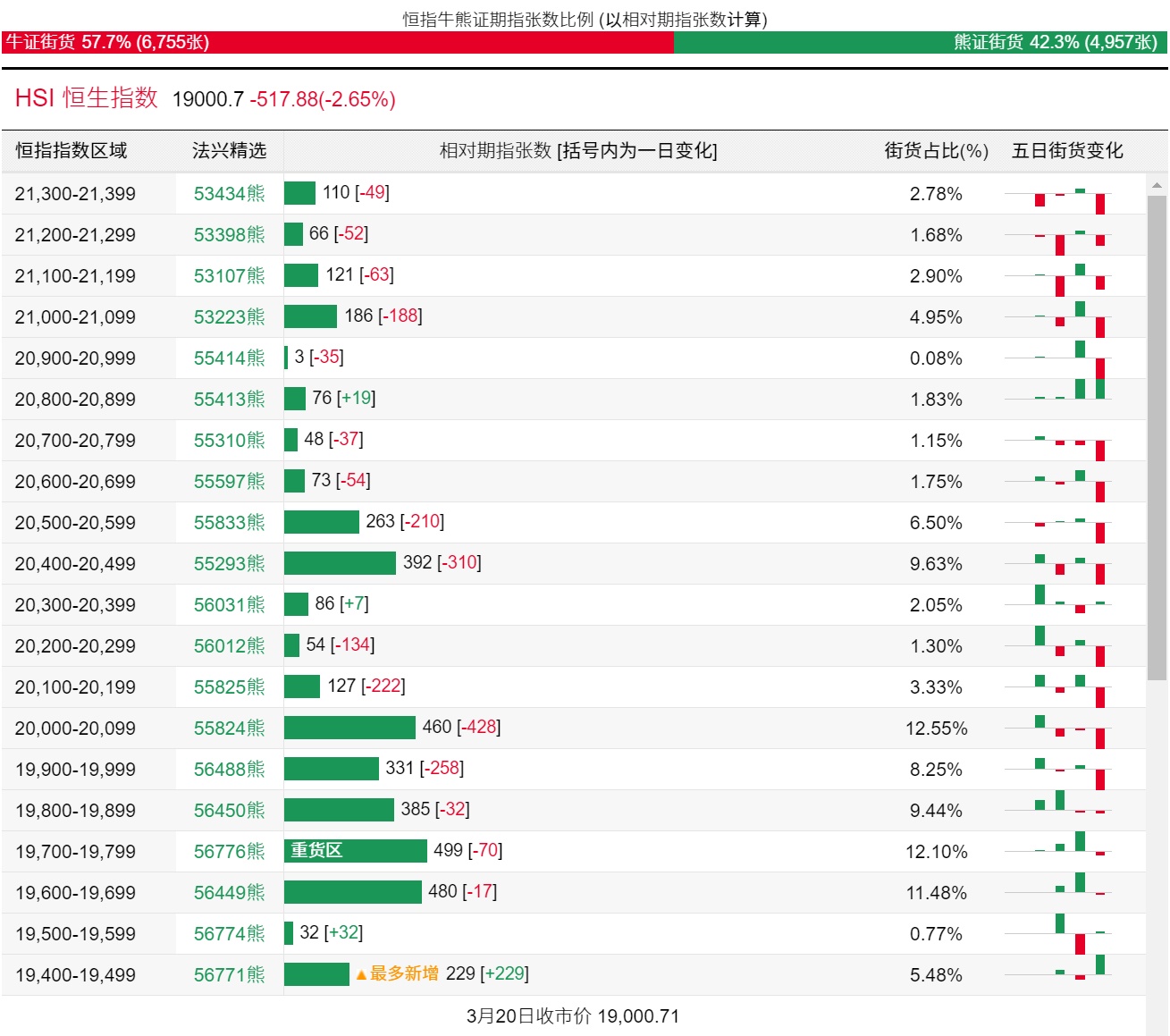 智通财经APP获悉,截至3月21日,恒指最新的牛熊街货比例为58:42。