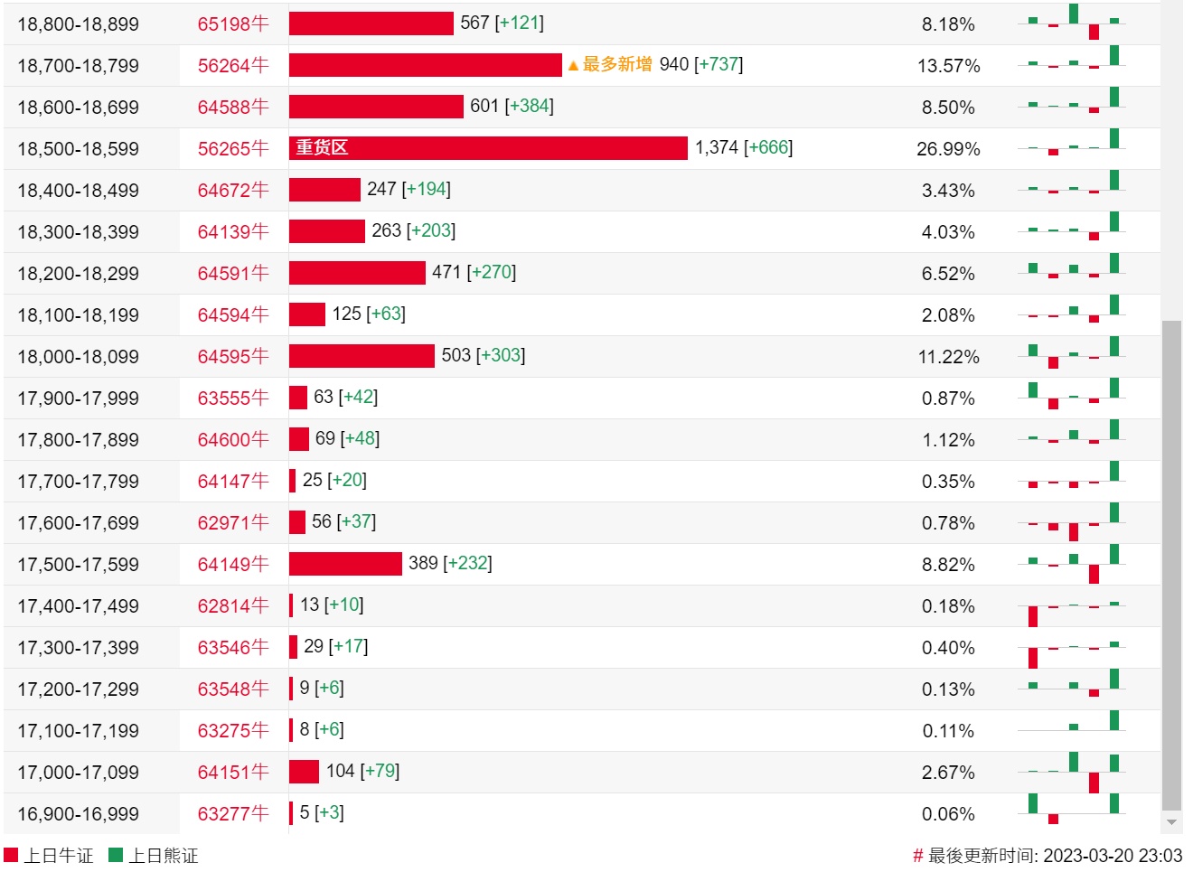 牛证街货重货区在18500-18599区间,该区间最新牛证数量为1374张,较上一交易日减增加666张;最多新增在18700-18799区间,该区间最新牛证数量940张,较上一交易日增加737张。