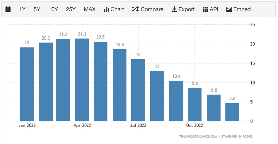 高企的房贷利率挤压人们的负担能力,将购房者拒之门外。美国全国房地产经纪人协会(NAR)公布的数据显示,1月成屋签约销售指数(Pending Home Sales Index)同比下跌24.1%。美国成屋销售占住房销售量的约九成,该指标可视为成屋销售的领先指标,用来衡量美国整体房屋销售的状况。此外,最新数据显示,12月标普凯斯席勒(S&P/CS)全美房价指数连续第六个月下滑,环比下跌0.9%;同比上涨4.6%,但创下2020年7月以来的最低同比涨幅。