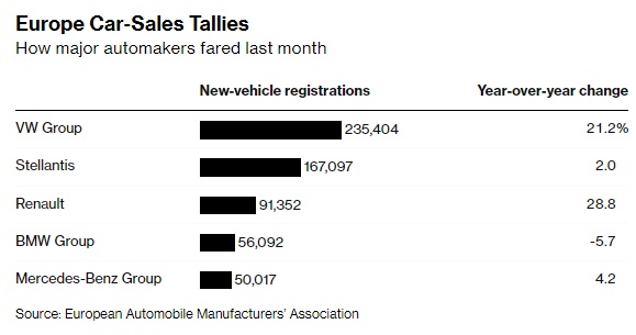 在欧盟国家,纯电动汽车上个月的注册量占比超过12%,高于一年前的9.7%。特斯拉(TSLA.US)的Model Y是去年最畅销的电动汽车,而大众汽车和Stellantis NV正准备在未来几个月推出几款电池驱动的车型。