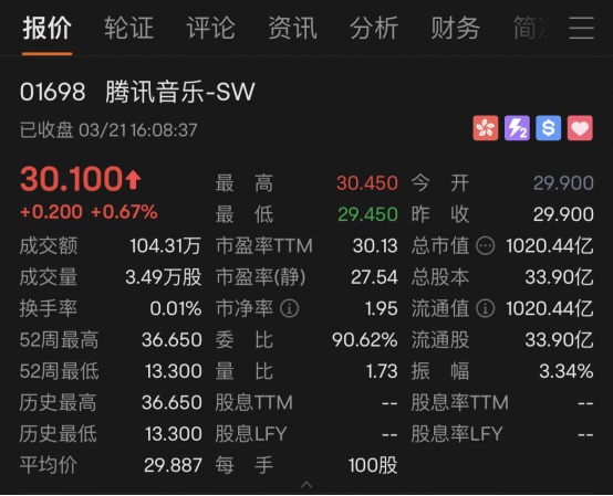 北京时间3月21日,港股板块开盘持续走高,截至当日收盘,恒生指数上涨258.05点,涨幅1.36%;恒生科技指数上涨94.9点,涨幅2.45%。在市场的提振下,多支热门回港中概股持续走高,其中,百度上涨3.21%,阿里巴巴上涨1.64%,腾讯音乐上涨0.67%,网易上涨0.23%。当日,腾讯音乐娱乐集团(TME.US;01698)发布了截至2022年12月31日的第四季度及全年未经审计财务报告。