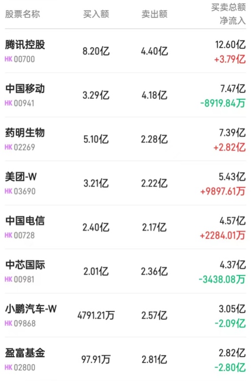 北水净买入最多的个股是腾讯(00700)、药明生物(02269)、美团-W(03690)。北水净卖出最多的个股是恒生中国企业(02828)、南方恒生科技(03033)、盈富基金(02800)。