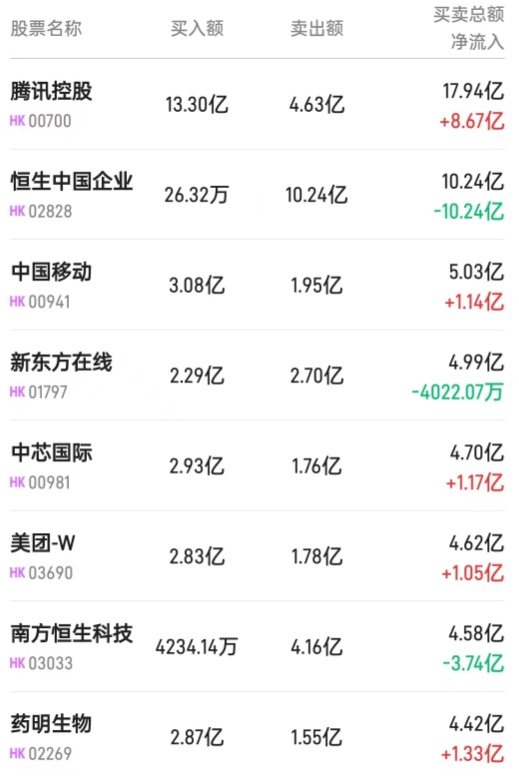 ETF方面,恒生中国企业(02828)、南方恒生科技(03033)、盈富基金(02800)分别遭净卖出10.23亿、3.73亿、2.79亿港元。