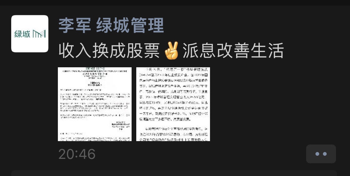 3月20日20:46分,这位绿城管理的CEO在朋友圈里说:“收入换成股票,派息改善生活”。他还幽默的加上一个V字的胜利手势。