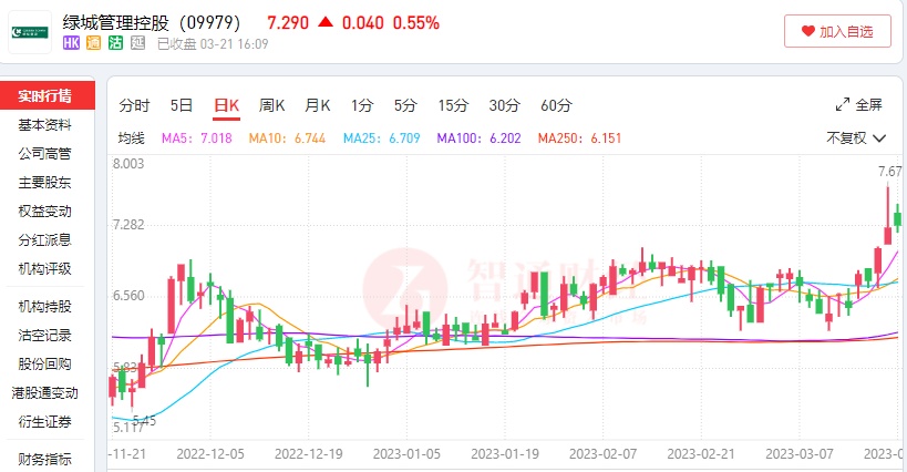 在李军的增持和2022年强劲业绩的助推之下,3月20日早盘绿城管理早盘最高涨近9%,后尾盘涨幅回落到2.98%,这在恒生指数近乎-3%股灾式崩盘的背景下极为难得。2.98%的涨幅,亦在当日百亿市值以上的港股标的涨幅中排名第4位。