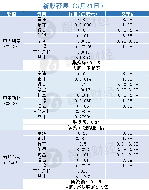 智通财经APP获悉,中天湖南(02433)、中宝新材(02439)、力盟科技(02405)正在招股中。截至3月21日,富途、辉立、华盛等合计为中天湖南借出孖展0.13372亿港元,认购未足额;合计为中宝新材借出孖展0.72909亿港元,超购逾1倍;合计为力盟科技借出孖展0.82921亿港元,超购逾4.5倍。