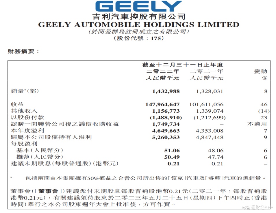 据智通财经APP观察,吉利汽车2022年业绩保持稳健成长,得益于集团新能源、智能化、国际化、高端化取得显著进展,汽车产品销售呈现“品牌升、销量增、结构优”的特点。