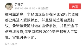 还有传言称(见下图),非美国企业存在美国银行的资金都已经进入受限状态,并且强制签署自愿协议,承诺接受随时增加监管条款,并且资金不做离境操作,没支取超过2000美元都要人工审批,审批时长不定。