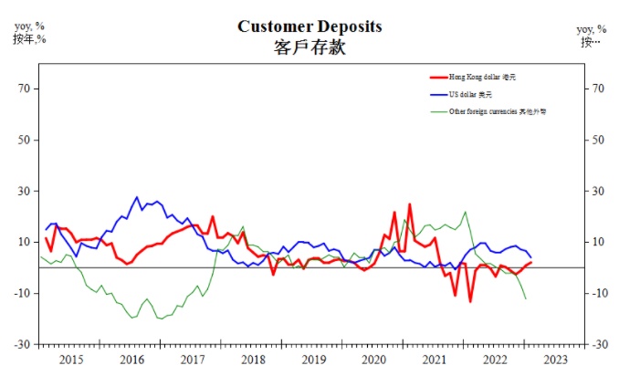 2020年以来,港元汇率一直处于强方水平,资金持续回流,香港金管局从市场吸纳500亿美元,相应地向银行体系注入4,000亿港元,确保市场资金充裕。2021年-2022年,香港银行存款总额增长了8.4%,令“走资”的说法不攻自破。