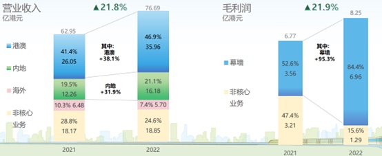 回到中国建筑兴业的业务层面,2022年公司幕墙业务表现表现最为亮眼,录得收入57.84亿港元,相比上年同期大幅度增加29.2%,成为公司“高增长”的中坚力量。按地区为划分,该公司港澳地区实现营收约35.96亿港元,同比38.1%,占总营收的46.9%,内地市场实现16.18亿港元,同比增长31.9%。港澳、内地幕墙营收同步高增,正以强劲的表现,推动公司步入高速增长的轨道。
