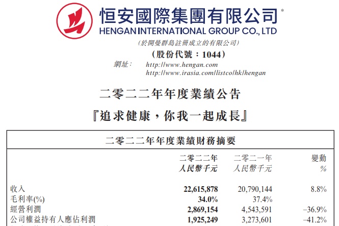 智通财经APP获悉,3月22日,恒安国际(01044)发布2022年全年业绩公告,财报显示,恒安国际2022年全年净利润19.3亿元,同比减少41%;营收226.2亿元,同比增长8.8%。截至发稿,恒安国际报35.25港元/股,跌0.42%。