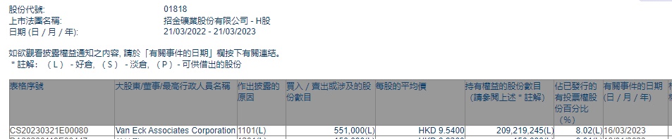 智通财经APP获悉,香港联交所最新资料显示,3月16日,Van Eck Associates Corporation增持招金矿业(01818)55.1万股,每股作价9.54港元,总金额为525.654万港元。增持后最新持股数目约为2.09亿股,最新持股比例为8.02%。