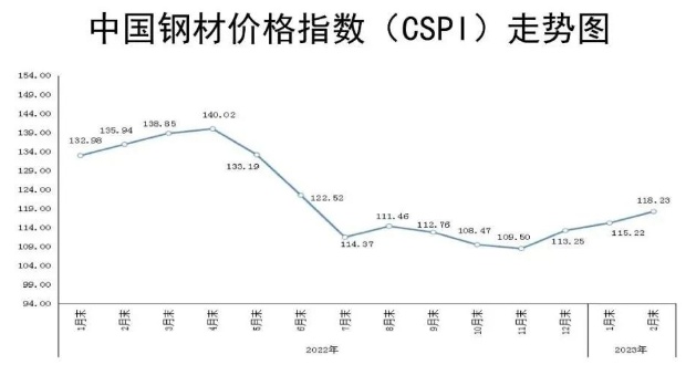 智通财经APP获悉,据钢铁协会监测,2月末,中国钢材价格指数(CSPI)为118.23点,环比上升3.01点,升幅为2.61%;比年初上升4.98点,升幅为4.4%;同比下降17.71点,降幅为13.03%。