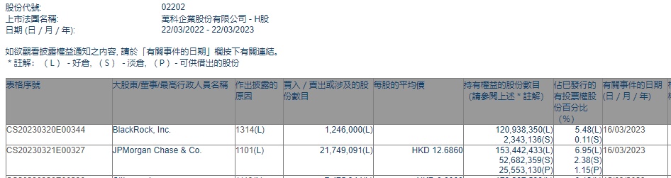 智通财经APP获悉,香港联交所最新资料显示,3月16日,小摩增持万科企业(02202)2174.9091万股,每股作价12.6860港元,总金额约为2.76亿港元。增持后最新持股数目约为1.53亿股,最新持股比例为6.95%。