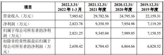 财务方面,于2019年度、2020年度、2021年度及2022年1-3月,公司实现营业收入分别约2.22亿元、2.48亿元、2.98亿元、7985.62万元;净利润分别约为7119.29万元、7954.98万元、9358.59万元、2823.78万元。