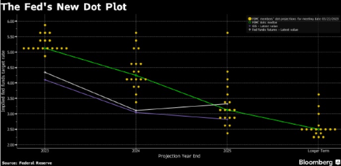据点阵图显示,美联储决策者预计2023年末通胀率为5.1%左右,与去年12月点阵图中的预测一致。 2024年利率预测中值从4.1%升至4.3%。